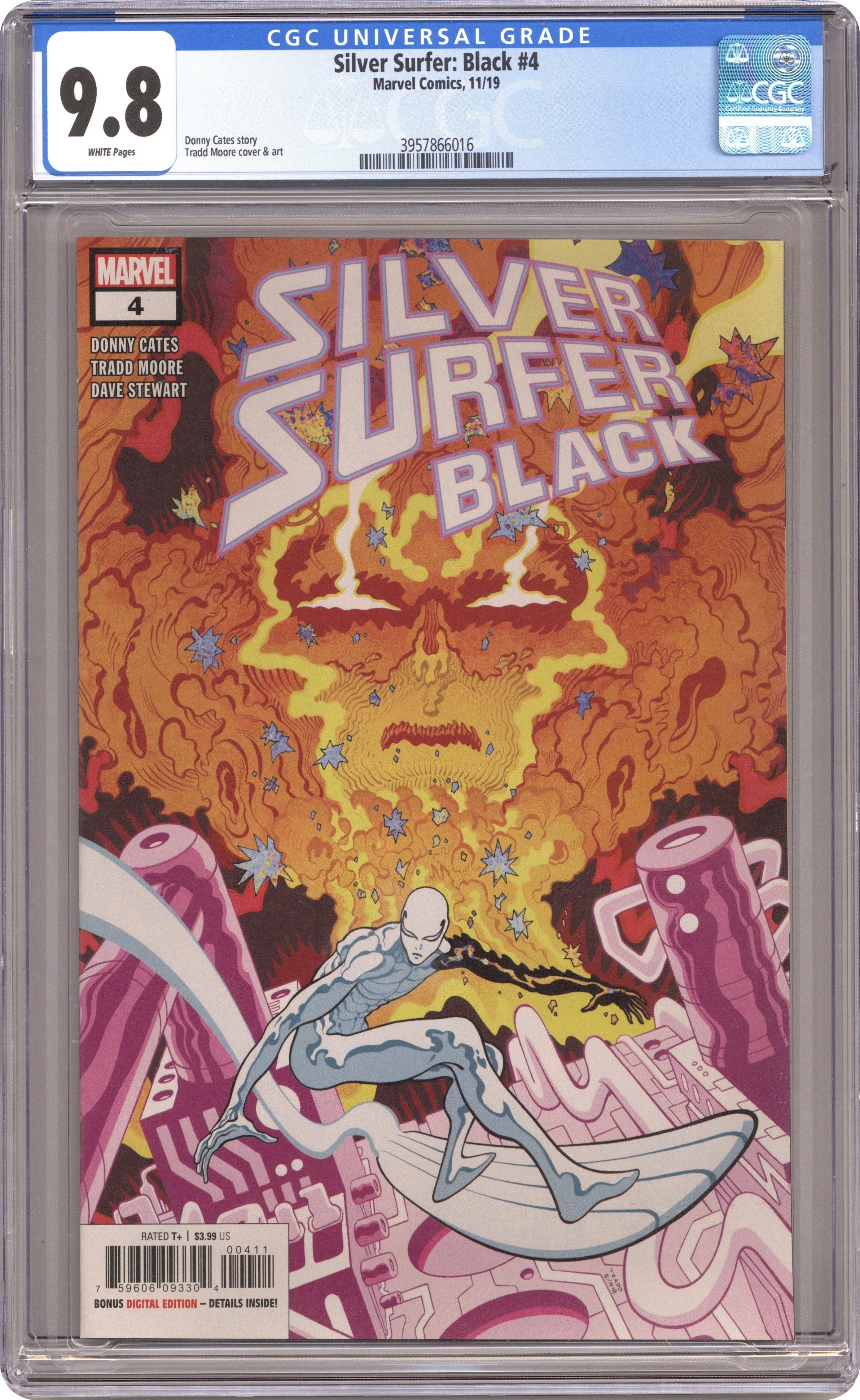 Written by Donny Cates. Art by Tradd Moore. Cover by Ron Lim. The Surfer's power is fading! Is this the end of Norrin Radd as the all-consuming darkness descends upon him? Or will help come in the form of an unexpected ally? 28 pages, full color. Rated T+ Cover price $3.99.