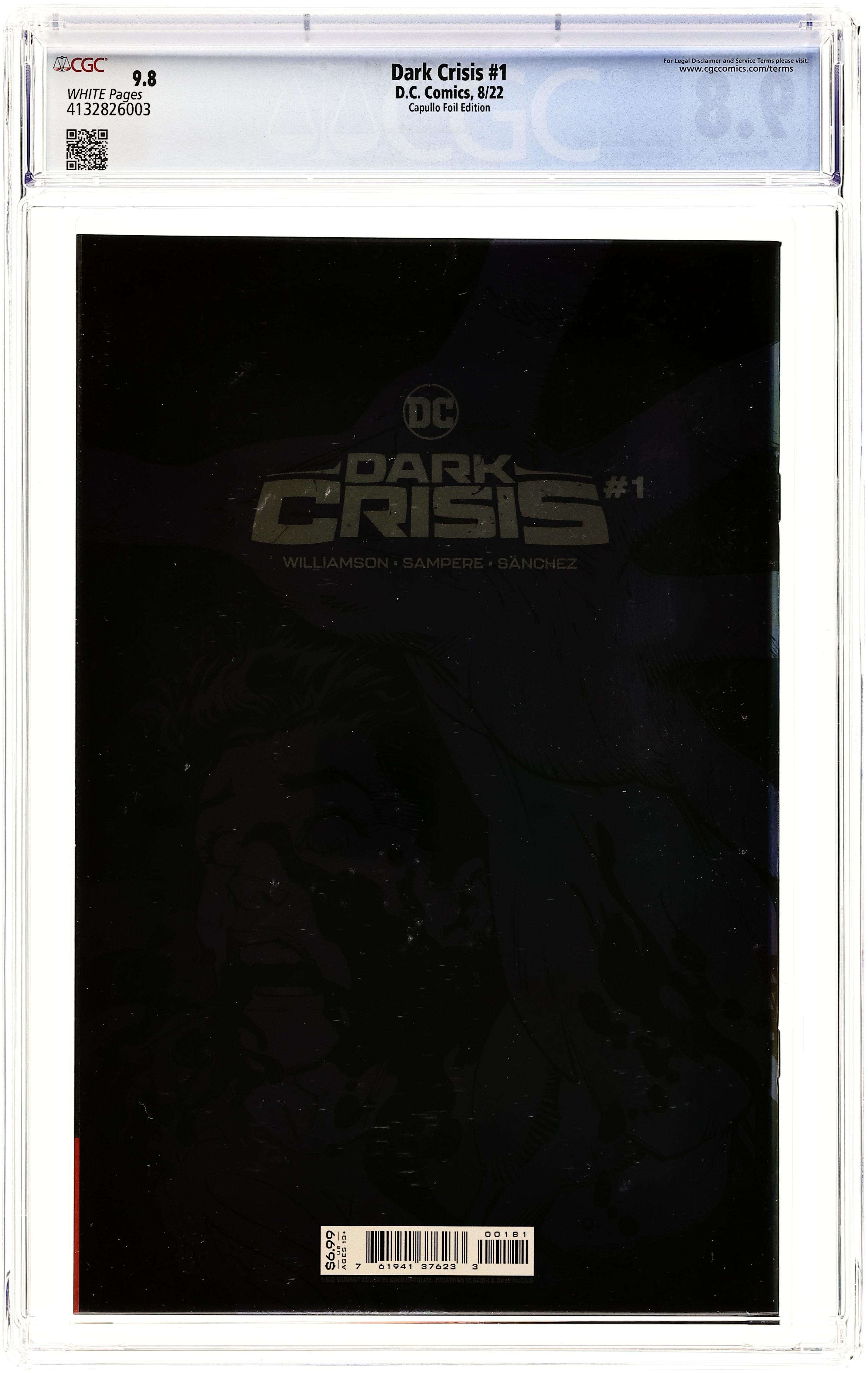 Limited 1 for 100 Retailer Incentive Variant Cover. Written by Joshua Williamson. Art by Daniel Sampere. Cover by Greg Capullo, Jonathan Glapion, Dave McCaig. Crisis on Infinite Earths. Infinite Crisis. Final Crisis. And now...Dark Crisis! The epic event years in the making is finally here! Superman, Batman, Wonder Woman, and the rest of the Justice League are dead. The remaining heroes are left to protect the world from an onslaught of violent attacks by DCs greatest villains! Can the legacy heroes step out of the shadows of the classic heroes to form a new Justice League? And will that be enough to stop a darkness greater than anything theyve ever faced from destroying everything? Dont miss out on the first issue of the blockbuster event of the summer! 40 pages, full color. Rated T+ Cover price $6.99.