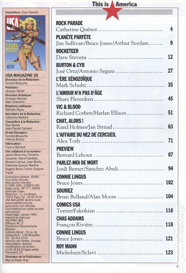 French Series. Cover by Dave Stevens. Cover reprinted from Jungle Comics (1988 Blackthorne) #1. Contents include a Rocketeer episode by Stevens ("Cliff's New York Adventure", from The Rocketeer Adventure Magazine #1, a Xenozoic Tales episode by Mark Schultz (partial), the last installment of Batman: The Killing Joke by Alan Moore and Brian Bolland and other American and European comics. 8-1/2" x 11-1/2", 132 pages, full color, French language.