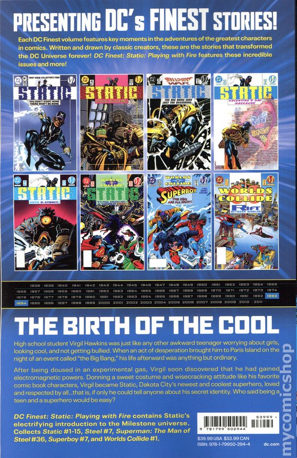 1st printing. Collects Static (1993 DC) Milestone #1-15, Superman: The Man of Steel (1991-2003) #36, Superboy (1994-2002 3rd Series) #7, and Worlds Collide (1994). Written by Dwayne McDuffie, Robert L. Washington III, Kurt Busiek, Sholly Fisch, Louise Simonson, Karl Kesel, and Dwayne McDuffie. Art by John Paul Leon, Steve Mitchell, Rober Quijano, Brian O'Connell, Shawn Martinbroug, Wilfred Quijano, Rober Quijano, Neil Vokes, Prentice Rollins, Bobby Rae, Jon Bogdanove, Dennis Janke, Tom Grummett, Doug Hazlewood, Chris Batista, Mark Bright, Chriscross, Denys Cowan, and John Paul Leon. Cover by Denys Cowan and Jimmy Palmiotti. THE BIRTH OF THE COOL! High school student Virgil Hawkins was just like any other awkward teenager worrying about girls, looking cool, and not getting bullied. When an act of desperation brought him to Paris Island on the night of an event called the Big Bang, his life afterward was anything but ordinary. After being doused in an experimental gas, Virgil soon discovered that he had gained electromagnetic powers. Donning a sweet costume and wisecracking attitude like his favorite comic book characters, Virgil became Static, Dakota City's newest and coolest superhero, loved and respected by all...that is, if only he could tell anyone about his secret identity. Who said being a teen and a superhero would be easy? This DC Finest volume showcases Static's electrifying origin! Softcover, 480 pages, full color. Teen Cover price $39.99.