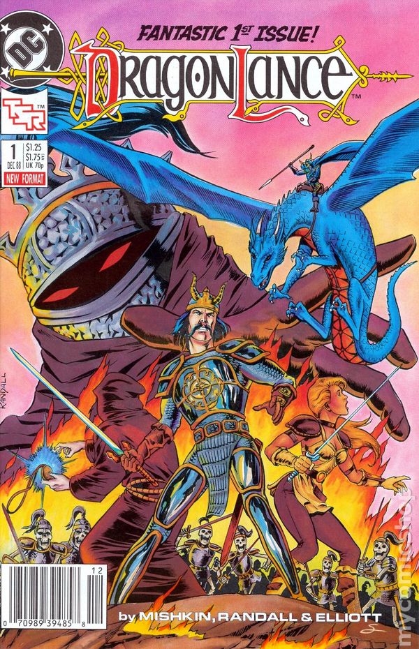 Newsstand Edition. DC Comics and TSR, the foremost creator of fantasy adventure games, have joined forces for an all-new line of comics based on TSR's popular books and games. The adventure begins with DRAGONLANCE, opening the door to the magical world of Krynn, where the evil Dragonlords rule...but not without opposition from the mighty Champions of Krynn. Among their number is Sturm, steadfast Knight of Solamnia, veteran of the War of the Lance, and sworn enemy of the tyrants of Krynn. Sturm saves a young woman menaced by demons, a chance encounter that brings her to the Monks of Majere...who reveal a powerful and terrifying secret. Based on one of TSR's most popular games, DRAGONLANCE is written by Dan Mishkin and features art by Ron Randall and Randy Elliott. Cover by Randall. New Format. Cover price $1.25.