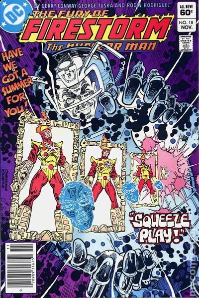 Newsstand Edition. Tokamak settles the score with Enforcer, then pits his plasma power against Firestorm's fusion power in "Squeeze Play!" Part 5 of 6, continued from the previous issue. Story continues in Firestorm (1982-90) Annual #1. Script by Gerry Conway, pencils by George Tuska, inks by Rodin Rodriguez. Letters column includes fan letter by comics writer Ed Brubaker. Pat Broderick/Dick Giordano cover. Cover price $0.60.