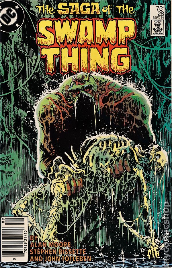 Alan Moore begins the "American Gothic"! First stop on Swamp Thing's dark journey: a subterranean vampire town. Art by Stan Woch and John Totleben. Cover by Stephen Bissette and Totleben. Cover price $0.75.