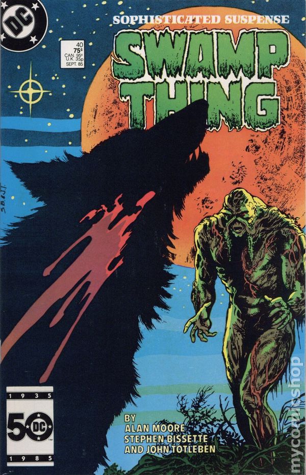 Alan Moore begins the "American Gothic"! First stop on Swamp Thing's dark journey: a subterranean vampire town. Art by Stan Woch and John Totleben. Cover by Stephen Bissette and Totleben. Cover price $0.75.