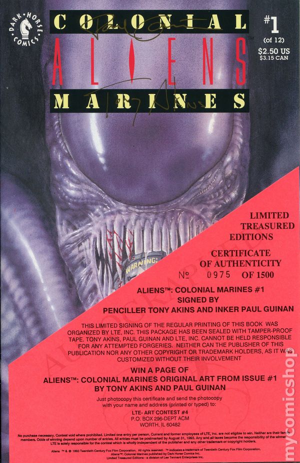 Limited Treasured Edition Signed Edition - limited to 1500 signed copies, signed by Tony Akins and Paul Guinan. Includes Certificate of Authenticity from Limited Treasured Editions. Script by CHRIS WARNER. Art by TONY AKINS & PAUL GUINAN. Cover painting by ROBERT MENTOR. Meet Lt. Joseph Henry - the son of one of the most influential politicians on Earth, a proud member of the Colonial Marines, and a poor slob in a heap of trouble. Lt. Henry, after yet again being charged with insubordination, is put in command of a platoon of the absolute worst Marines in the sector and assigned the lowest detail in the corp - checking up on a toxic waste dump! What Lt. Henry and company don't know is that this mission is about to go from bad to worse, because a strangely organized batch of Aliens has taken over the waste dump! Cover price $2.50.