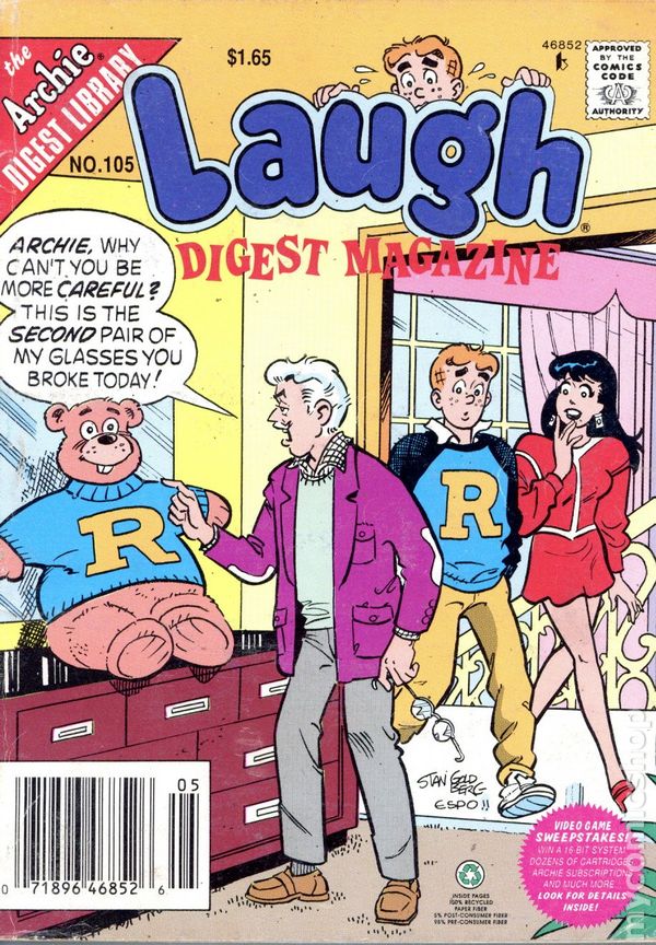 Cover pencils by Stan Goldberg, inks by Henry Scarpelli. "Shoe Shoe, Baby," script by Frank Doyle, art by Rex Lindsey; Reggie tries to scam Jughead out of $10 with a fake famous horseshoe, but Jughead turns the tables and gets $50 from Reggie. "Blooming Beauties" starring Katy Keene, script and art by Richard Pietrzyk; Flowera tries to wreck a fashion show because it was held at her neighbor's estate instead of hers, but fails. "The Judge," script and pencils by Joe Edwards, inks by Rudy Lapick; Little Archie accidently hits a ball at Little Veronica, so she throws it into a yard guarded by Killer. "Fashion Passion," script by George Gladir, pencils by Stan Goldberg, inks by Rudy Lapick; Sabrina tells her aunts that their fashion sense is too 1600's, but when they try current fashion they look even more ridiculous, so Sabrina fools them back into their old clothes. Recycling public service announcement with Archie and the gang. "The Song Is You," script by Mike Pellowski, pencils by Tim Kennedy, inks by Rudy Lapick; For a music class assignment, Archie must write a song about Midge and Moose must write one about Veronica. "Stress Struck," script by George Gladir, pencils by Stan Goldberg, inks by Rudy Lapick; Betty describes other people's stress and how easy her life is, and finds her stress is worrying about something coming along to mess it up. Plus puzzles, other stories, and more. 100 pgs., full color. Cover price $1.65.