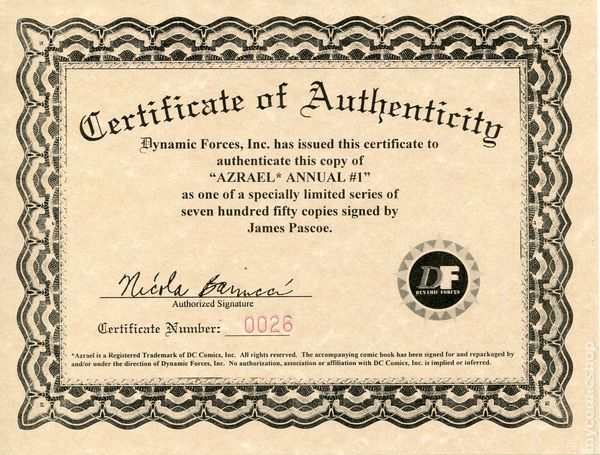 Dynamic Forces Signed Edition - Limited to 750 Signed and numbered Copies, Signed by James Pascoe. Includes Certificate of Authenticity from Dynamic Forces. A Year One Annual. Jean Paul Valley's father, the previous Azrael, begins his relentless pursuit of the murderous Carlton LeHah. Written by Dennis O'Neil, with art by David Ammerman, Barry Kitson, James Pascoe, Marcio Morais, Ken Branch, Rob Leigh and Pam Eklund. 60 pages. Miraweb Format. Cover price $3.95. Cover price $3.95.