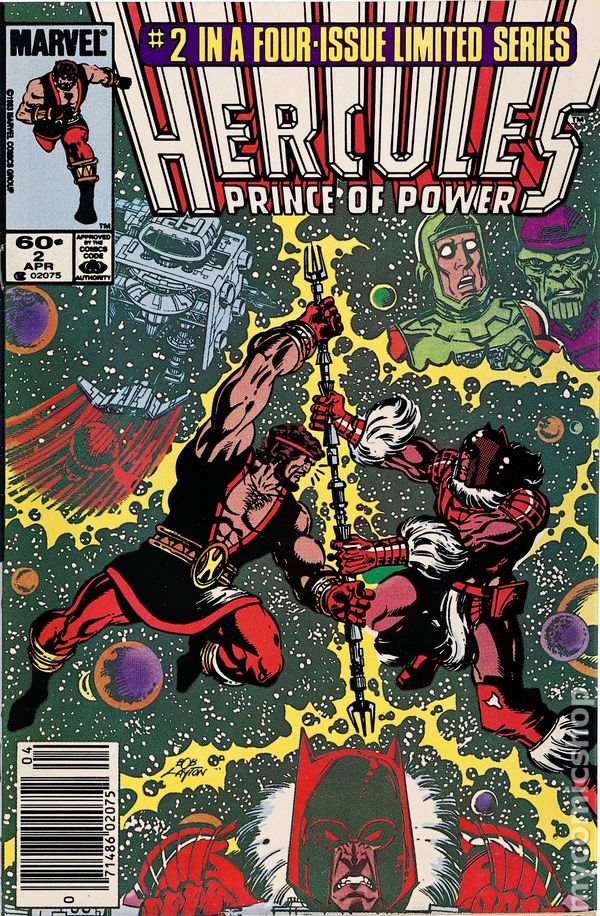 Newsstand Edition. "Deadly Legacy." Guest-starring Starfox and Mentor. Captain Marvel cameo. Story and art by Bob Layton. Hercules and his friends are summoned by Mentor to Titan, home of the space Eternals. Here the Sun god Apollo lies at death's doorstep. Apollo warns his brother of their father's insanity and the murder of the Olympian gods. But first Hercules must contend with Shreck, a disciple of the mad titan Thanos. Can even the Lion of Olympus stand against a villain who possesses the power of the deceased Captain Marvel's Nega-Bands? 32 pages. Cover price $0.60.