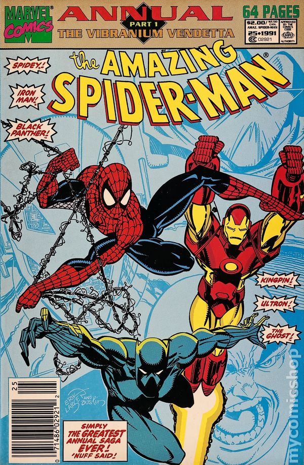 Newsstand Edition. "The Spider and the Ghost!" Guest-starring Iron Man and the Black Panther. Part 1 of the Vibranium Vendetta. Script by David Michelinie. Pencils by Guang Yap. Inks by Jeff Albrecht. Cover by Erik Larsen and Terry Austin. Roxxon Oil has created a synthetic form of vibranium! And it's an economic and industrial game-changer across the globe! However, a scientific breakthrough of this magnitude draws the interest of both the good guys and the bad guys! Is Roxxon's new vibranium on the up-and-up? Spider-Man and the Black Panther pay a visit to Roxxon's secret laboratory to get a closer look! But the Ghost is already there! And so is Sunturion! So much for the heroes' sneak preview! The web-slinger and T'Challa will recon by force! Story continues in Spectacular Spider-Man Annual 11. Cameo appearance by Mary Jane Watson, Ultron, and the Kingpin. First backup story: "The Origin of the Amazing Spider-Man!" Script by David Michelinie. Art by Sal Buscema. Re-telling of the web-slinger's origin. Second backup story: "Outlaw Justice" Part 1 of 3. Script by David Michelinie. Art by Alan Kupperberg. Silver Sable recruits the Rocket Racer, Will-O'-the-Wisp, and the Prowler for a special mission. Story continues in Spectacular Spider-Man Annual 11. Third backup story: "The Truckstop of Doom!" Script by David Michelinie. Pencils by Paris Cullins. Inks by Bud LaRosa. Venom shows his nice side by breaking up a truckstop robbery. Fourth backup story: "Second Chance!" Script by David Michelinie. Art by Steve Ditko. Backup feature: "Bullpen Bulletins" Script by Barry Dutter. Art by Rick Parker. One-page parody of the Marvel bullpen. (Note: Splash page art by Guang Yap and Jeff Albrecht.) 68 pages. Cover price $2.00.