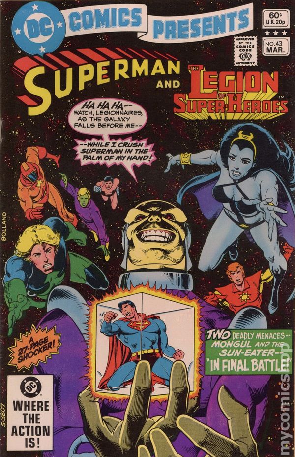 Direct Edition. In Final Battle - Written by Paul Levitz. Art by Curt Swan and Dave Hunt. Cover by Brian Bolland. A 27-page shocker! When Superman faces a threat from the Sun-Eater and Mongul and the danger of Earth's destruction, Jimmy Olsen summons the Legion of Super-Heroes to help. Characters in this issue: Legion of Super-Heroes [Sun Boy; Cosmic Boy; Brainiac 5; Wildfire; Element Lad; Shadow Lass; Supergirl (cameo); Ferro Lad (flashback)]; Justice League of America [Green Lantern [Hal Jordan] (cameo); Red Tornado (cameo); Black Canary (cameo); Superman]; Jimmy Olsen; Lois Lane; the Sun-Eater (villain); Mongul (villain). Also: Batman in 1-page Hostess Twinkies ad "The K-9 Caper!" by Bob Rozakis, Curt Swan and Vince Colletta. 32 pages, full color. Cover price $0.60.