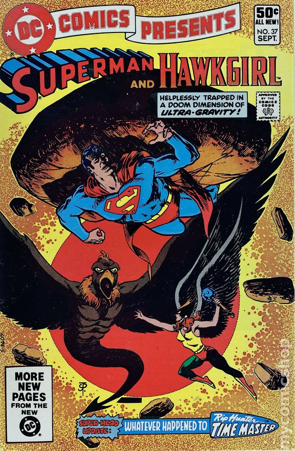 Direct Edition. Last 50c cover-priced issue. Cover by Jim Starlin. Stories by Jim Starlin & Roy Thomas and Mike Tiefenbacher. Art by Jim Starlin, Alex Saviuk, Romeo Tanghal and Vince Colletta. While on an archeological dig, Hawkgirl sees a chamber with Kryptonese inscriptions and contacts Superman for help in "The Stars, Like Moths...!" by Jim Starlin (plot and pencils), Roy Thomas (script) and Romeo Tanghal (inks, uncredited). Characters in this story: Superman [Clark Kent]; Hawkgirl [Shayera Hol]; Dr. Irwin Wright; Var-El (flashback); Krypton (flashback). Plus: Back-up story "Whatever Will (or Did) Happen to Rip Hunter, Time Master" by Mike Tiefenbacher, Alex Saviuk and Vince Colletta. Characters in this story: Bonnie Baxter; Corky Baxter; Rip Hunter; Jeff Smith; John Charles James (villain). Also: Wonder Woman in 1-page Hostess Twinkies ad "The Robot Master" by Bob Rozakis, Curt Swan and Vince Colletta. 32 pages, full color. Cover price $0.50.