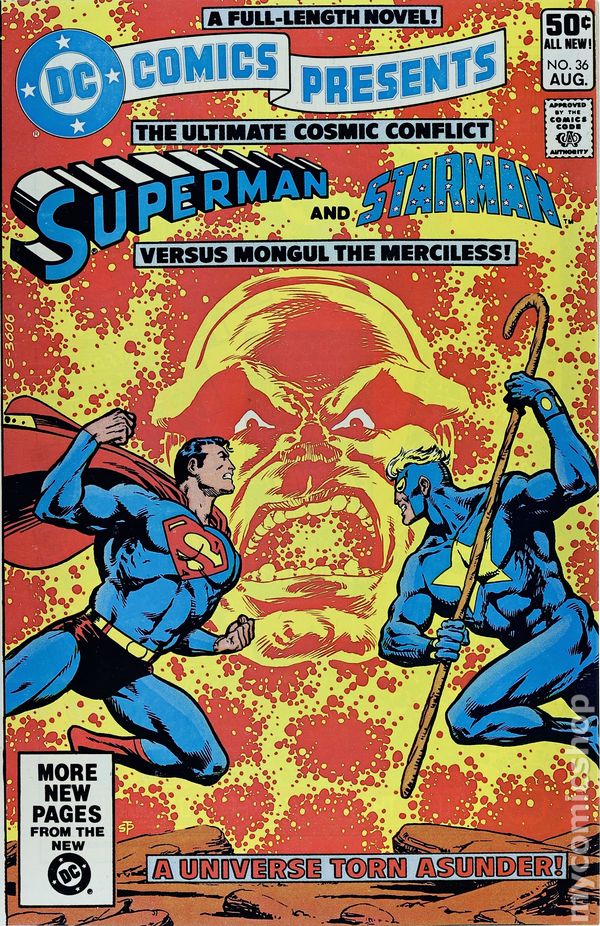 Direct Edition. Whatever Happened to Starman? - Written by Jim Starlin (co-plot) and Paul Levitz (co-plot and script). Art and Cover by Jim Starlin. A full-length novel! Superman and Starman team up to battle Mongul and rescue Starman's beloved Merria. Characters in this issue: Superman; Starman [Prince Gavyn]; Mongul (villain); Lady Merria; Jediah Rikane; Mn'Torr; Clryssa (flashback); Lord Protector Oswin (flashback). Also: Aquaman in 1-page Hostess Twinkies ad "Pirates' Gold" with pencils by Curt Swan. 32 pages, full color. Cover price $0.50.