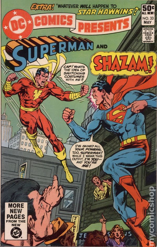 Direct Edition. Cover by Rich Buckler and Dick Giordano. Stories by Gerry Conway & Roy Thomas and Mike Tiefenbacher. Art by Rich Buckler, Alex Saviuk, Dick Giordano and Vince Colletta. When Superman goes on a rescue mission, he discovers that he is in Captain Marvel's costume and has his powers in "Man and Supermarvel!" by Gerry Conway (plot), Roy Thomas (concept and script), Rich Buckler and Dick Giordano. Continues next issue. Characters in this story: Captain Marvel [Billy Batson]; Mary Marvel [Mary Batson]; Mr. Mind; Mr. Mxyzptlk; Jimmy Olsen; Supergirl [Kara Zor-El]; Superman [Clark Kent]; River-Rat Gang; Mrs. Potter. Plus: Back-up story "Whatever Will Happen to Star Hawkins?" by Mike Tiefenbacher, Alex Saviuk and Vince Colletta. Characters in this story: Star Hawkins; Ilda; Mr. Viozi; Stella Sterling; Automan; Corvan mercenaries (villains); Bio-Room (as the Head, villain). Also: Batman in 1-page Hostess Cup Cakes ad "Hearts of Darkness" with pencils by Curt Swan. Statement of Ownership, Management and Circulation in the book states that the average monthly number of sales of the comic is 134,211. 32 pages, full color. Cover price $0.50.