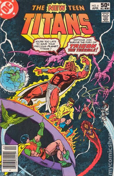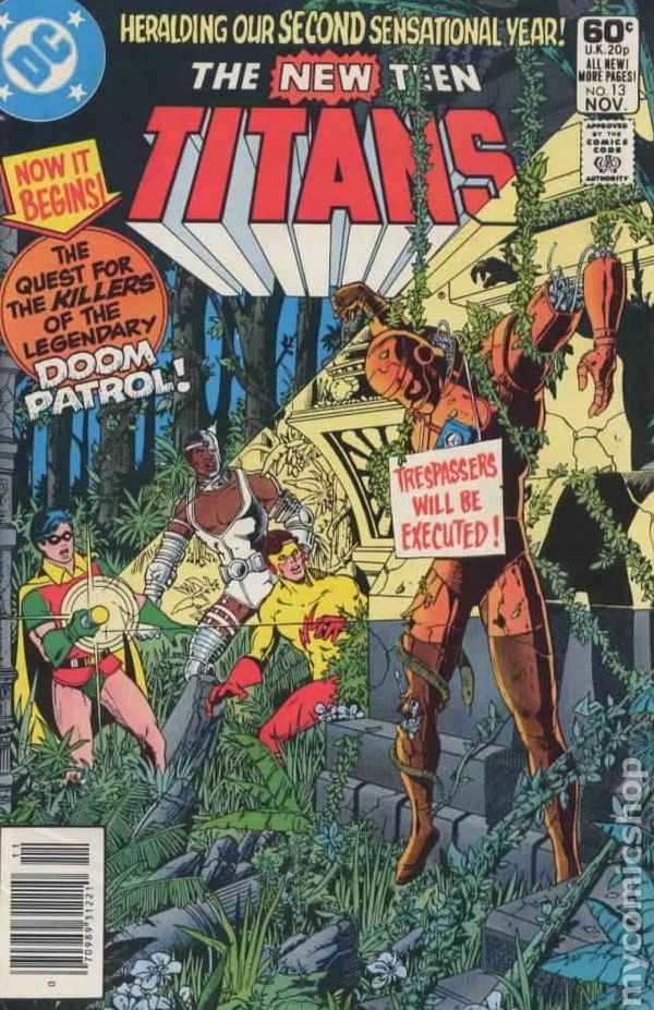Newsstand Edition. The mysterious Raven tries to convince Robin, Wonder Girl, Kid Flash, Changeling, Cyborg & Starfire to form a new Teen Titans team in "The New Teen Titans." Cameos by Bruce Wayne and Grant Wilson. Script by Marv Wolfman, pencils by George Perez, finishes by Romeo Tanghal. Cover by Perez & Dick Giordano. Cover price $0.50.