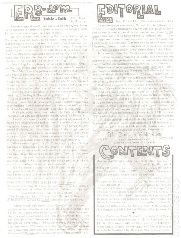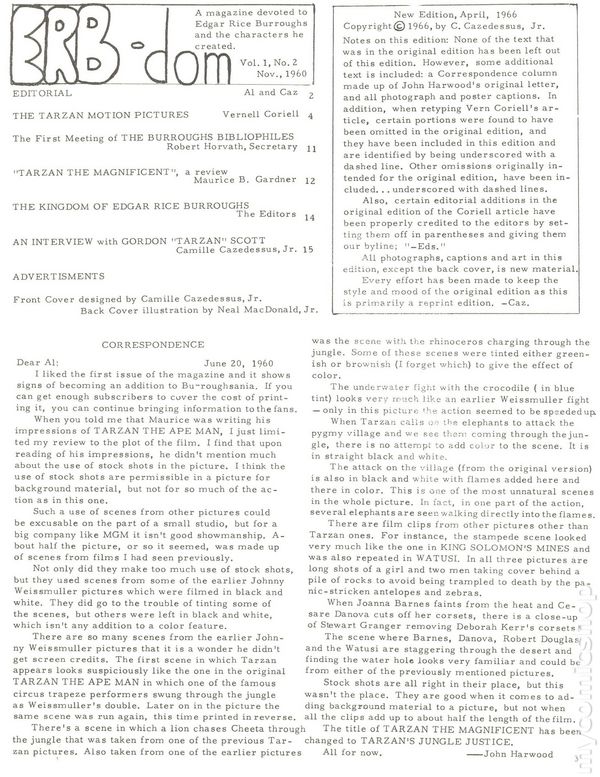 Issue #2 - Reprint April 1966, all text unedited but retyped and printed on better paper. ERB-dom was one of the best fanzines focusing on Tarzan creator Edgar Rice Burroughs. "The Tarzan Motion Pictures" by Vern Coriell, "The First Meeting of the Burroughs Bibliophiles" by Robert Horvath, Tarzan the Magnificent review, The Kingdom of Edgar Rice Burroughs, and an interview with Gordon Scott. 8 1/2-in. x 11-in., 16 pages, black and white.