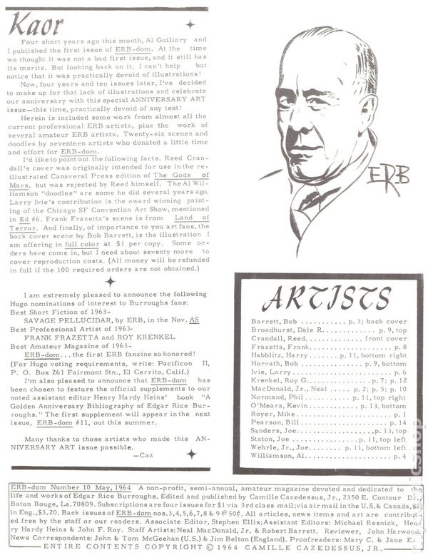 No. 10 - May 1964. ERB-dom was one of the best fanzines focusing on Tarzan creator Edgar Rice Burroughs. Issue #10 is a special pinup issue including art by: Reed Crandall (cover), Frank Frazetta, Joe Staton, Al Williamson, Larry Ivie, and others. 16 pages. Edited and published by Camille Cazedessus. Cover price $0.50.