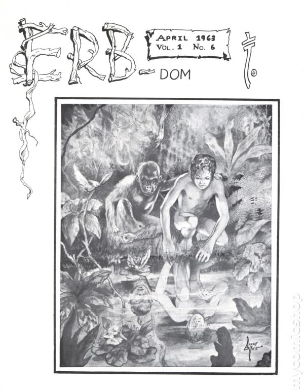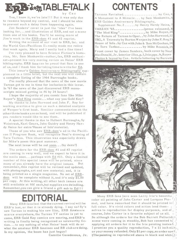 ERB-dom was one of the best fanzines focusing on Tarzan creator Edgar Rice Burroughs. Issue #6 includes the following articles: letters from Russ Manning, John Coleman Burroughs, and Gaylord DuBois, Burroughs Artist Larry Ivie (with art and photos), The Art of Jetan by Mike Resnick, The History of Life on Barsoom by Resnick, Tips for Collectors, and Toofani Tarzan (Indian-made movie). 16 pgs. April, 1963. Edited and published by Camille Cazedessus. Cover art by Ivie. Cover price $0.25.
