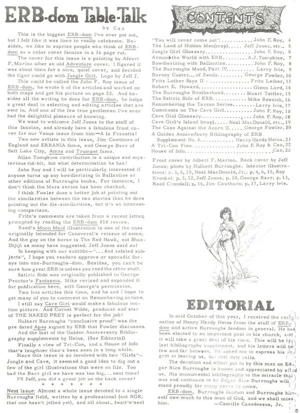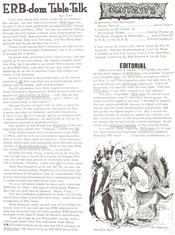 ERB-dom was one of the best fanzines focusing on Tarzan creator Edgar Rice Burroughs. Issue #3 includes the following articles: In Memory of Alfred Guillory Jr., A Discussion on Burroughs, Tarzan on the Turntables, addresses for other Burroughs fanzines, and The Throwback (a comparative review). 9 pgs. June, 1961. Edited and published by Camille Cazedessus. Cover art by Horvath.