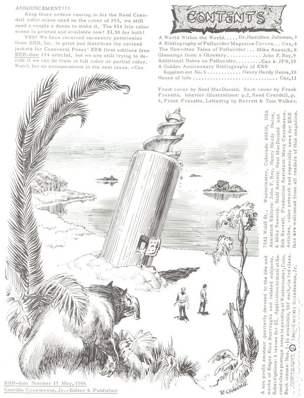 Issue #15 - Feb. 1966. Fanzine devoted to the work of Edgar Rice Burroughs. Cover by Reed Crandall, back cover by Roy Krenkel. Pellucidar issue with a centerfold map, articles by Camille Cazedessus, Mike Resnick, Peter Ogden, John Roy. 8 1/2-in. x 11-in., 16 pages, black and white. Cover price $0.50.