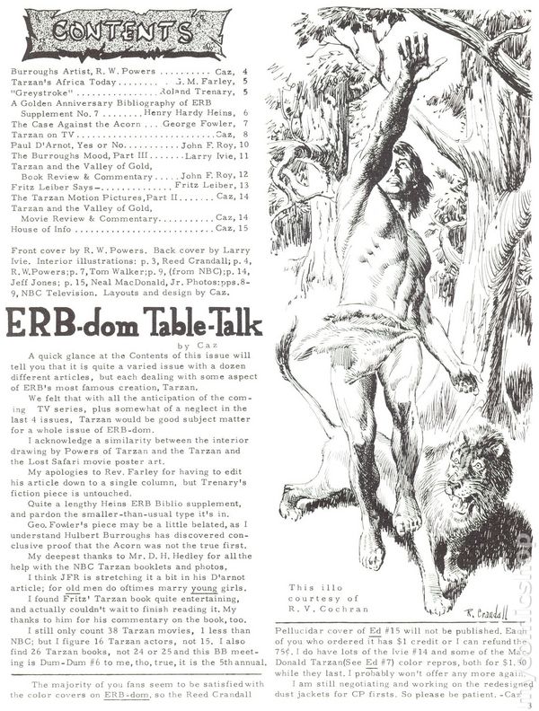 No. 18 - August 1966. Special Tarzan issue. "Burroughs Artist R. W. Powers," "Tarzan's Africa Today," "The Case Against the Acorn," "Tarzan on TV," "Paul d'Arnot--Yes or No," "The Burroughs Mood part 3" (by Larry Ivie), "Fritz Leiber Says," review of the "Tarzan and the Valley of Gold" movie, and news items. Tarzan illustration by Reed Crandall. Powers front cover; Ivie back cover. 16 pages on good quality white paper; black and white; 8.5-in. x 11-in. Cover price $0.50.