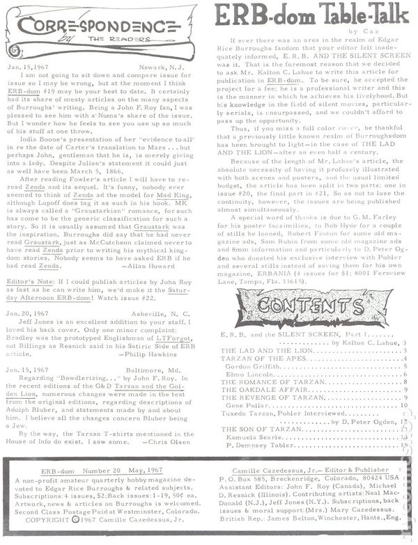 No. 20 - May 1967. "E.R.B. and the Silent Screen" covers early ERB-based films: The Lad and the Lion, Tarzan of the Apes, The Romance of Tarzan, The Oakdale Affair, The Revenge of Tarzan, Tuxedo Tarzan, and The Son of Tarzan. Photo cover. 8 1/2-in. x 11-in., 16 pages on good quality white paper, black and white. Cover price $0.50.