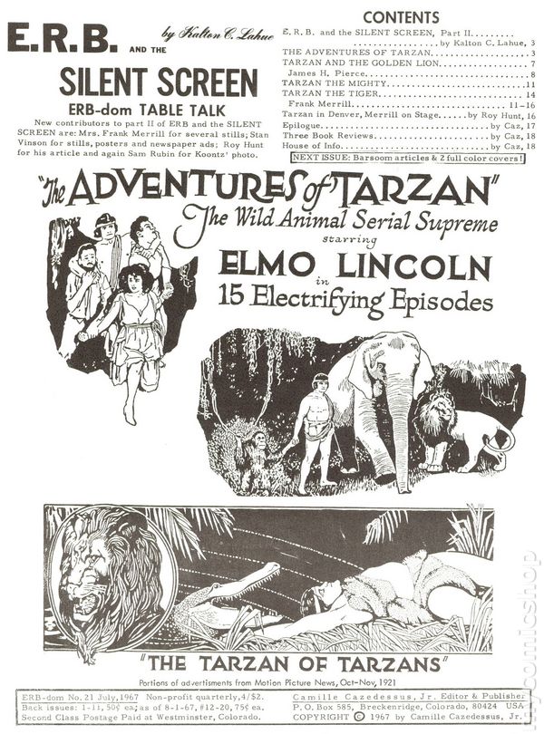 No. 21 - July 1967. Part two of "E.R.B. and the Silent Screen" covering The Adventures of Tarzan, Tarzan and the Golden Lion, Jungle Tales of Tarzan, Tarzan the Tiger, and Tarzan in Denver. Photo cover. Profusely illustrated with contemporary ads and movie stills. 8 1/2-in. x 11-in., 20 pages on good quality white paper, black and white. Cover price $0.50.