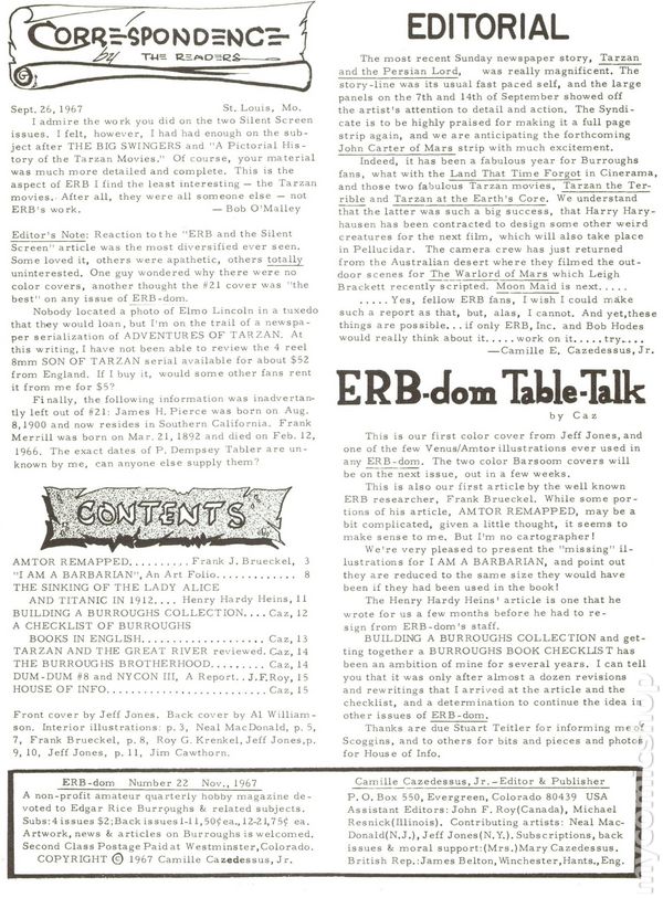 No. 22 - November 1967. "Amtor Remapped," ERB art of Jeff Jones, "The Sinking of Lady Alice and Titanic in 1912," and "Building a Burroughs Collection," "Tarzan and the Great River" movie review, and "The Burroughs Brotherhood," and news, including small photos of Frank Frazetta, Jeff Jones, and Harold Foster. Jeff Jones front cover; Al Williamson back cover. 16 pages on good quality white paper; black and white; 8.5-in. x 11-in. Cover price $0.50.