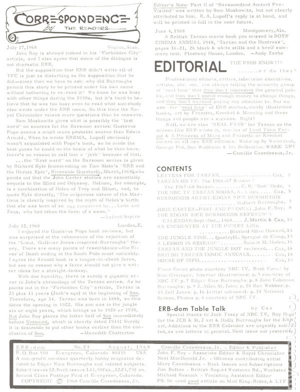 ERB-dom was one of the best fanzines focusing on Tarzan creator Edgar Rice Burroughs. Issue #24 includes the following: Tarzan on TV: The 1966-67 Series, The NBC TV Shows: An Index, art by Hulbert Burroughs, John Carter—Past and Present, ERB Calendars Sept, Oct, and Nov 1968, Fantasy Collector ad, The Jungle Vine poem by L. Sprague de Camp with art by Jeff Jones, Tarzan and the Jungle Boy, British Tarzan Comic Novels, and an article on the magazine Transition. Back cover art by Sam Grainger. 20 pgs. Aug, 1968. Edited and published by Camille Cazedessus. Cover price $0.50.