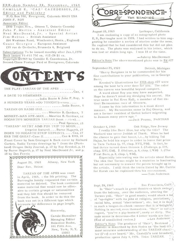 ERB-dom was one of the best fanzines focusing on Tarzan creator Edgar Rice Burroughs. Issue #28 includes the following: cover art by Sam Grainger, pinup by Larry Ivie, Ronald Adair in Tarzan of the Apes, Tarzan of the Apes the Play, Tarzan on Radio 1932, ad for Frazetta art folio, Monkey-Man Ape-Man, Hogarths Monsieur Tarzan (with photo), and a pinup by G. Barr. 20 pgs. Nov, 1969. Edited and published by Camille Cazedessus. Cover price $0.50.