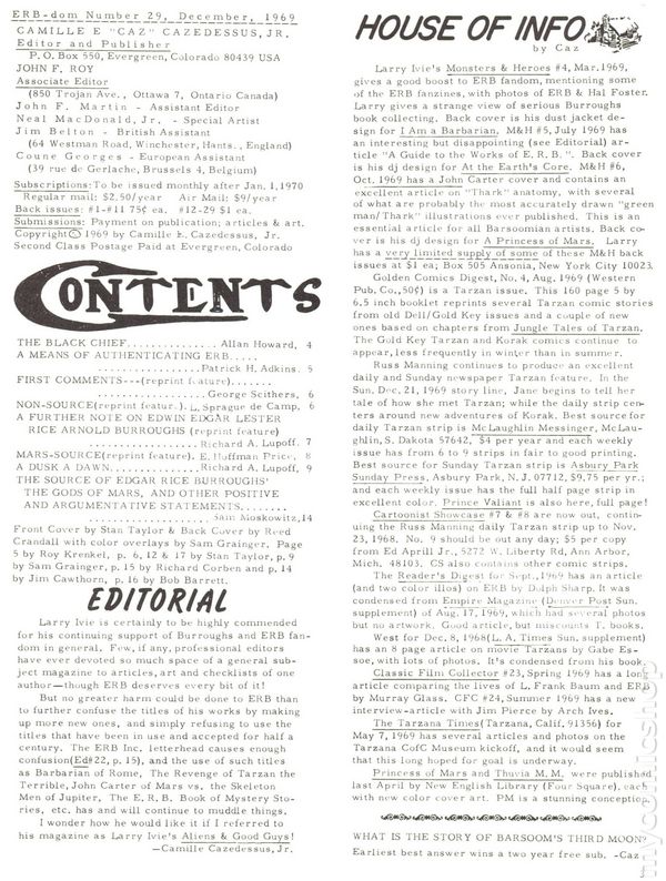 ERB-dom was one of the best fanzines focusing on Tarzan creator Edgar Rice Burroughs. Issue #29 includes the following: cover art by Stan Taylor and rear cover by Reed Crandell. 20 pgs. Dec, 1969. Edited and published by Camille Cazedessus. Cover price $0.50.