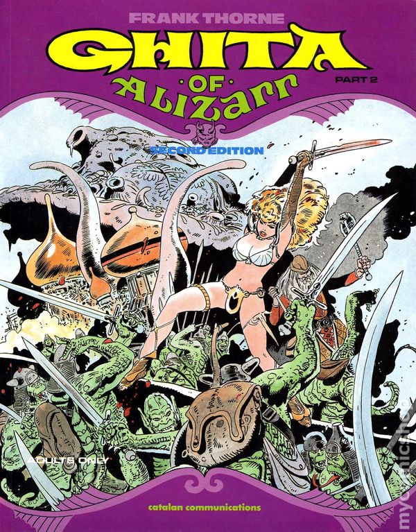 Catalan (2nd) Edition - Volume 1 - 1st printing. Story and art by Frank Thorne. Golden-spired Alizar has been overrun with demon hordes of lizardmen. Ghita, the royal mistress, barely escapes. Suddenly possessed with the spirit of a long-dead warrior, Ghita gathers a ragtag band and prepares to wage war on the conquerors. Delightful eroticism and high adventure! Softcover, 8 1/2-in. x 10 1/2-in., 48 pages, full color. Mature Readers Cover price $8.95.