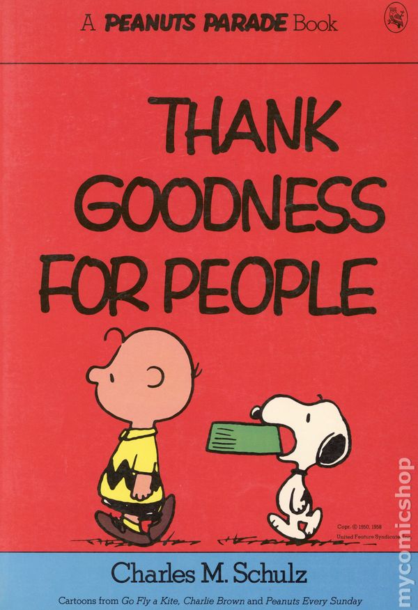 Volume 9 - 2nd and later printings. "Thank Goodness for People!" Story and art by Charles M. Schulz. Collections of one of the longest running and most beloved comic strips in history. Featuring Charlie Brown, Linus, Lucy, Snoopy, Woodstock and the rest of the Peanuts Gang. Softcover, 192 pages, B&W. All Ages Cover price $2.95.