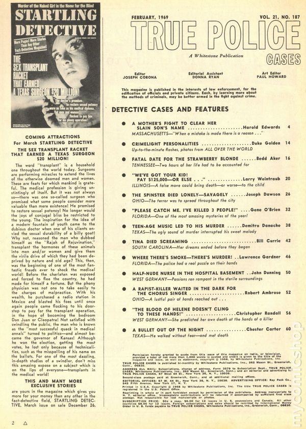 Photo cover. True Crime articles, stories and photos. 8-1/4 in. x 10-1/2 in., 66 p, B&W Cover price $1.95.