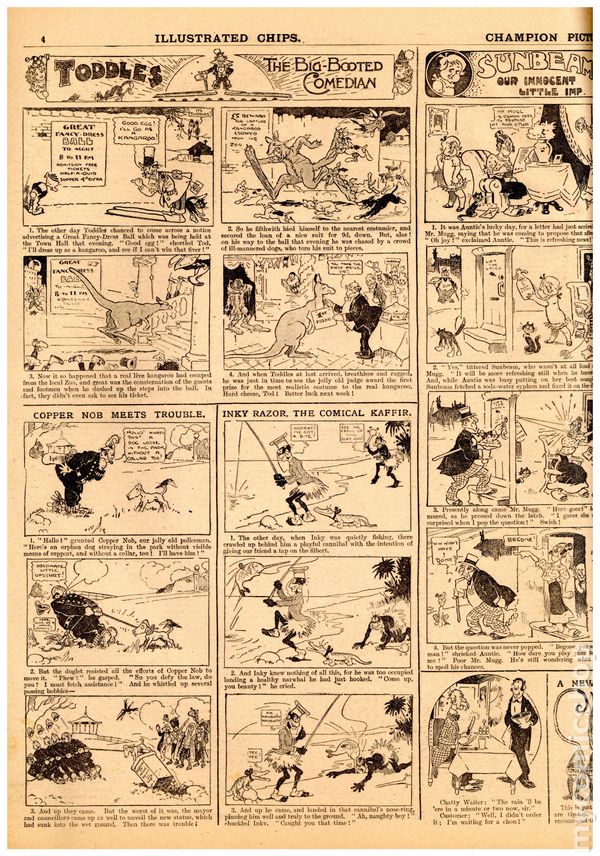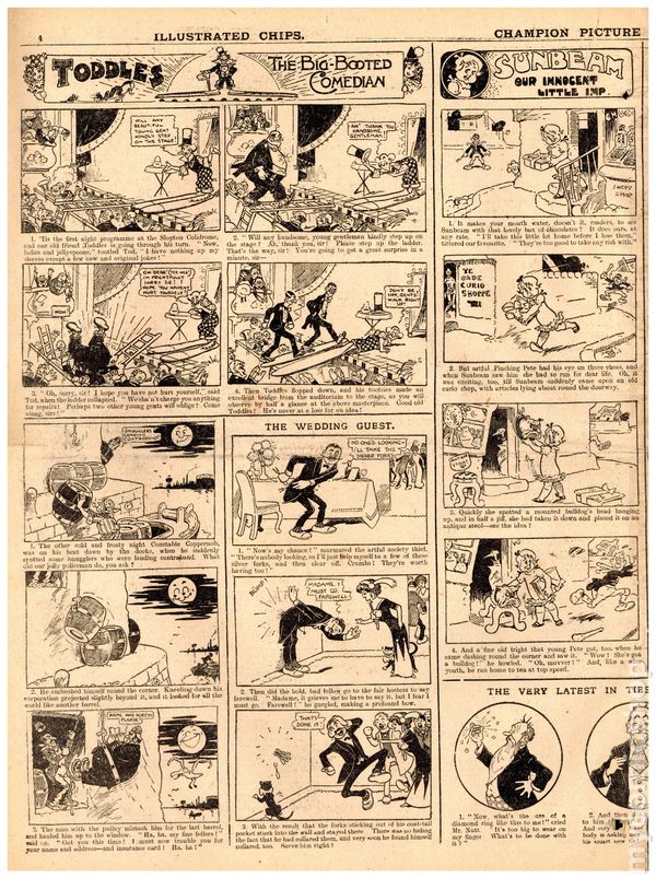 November 11, 1922. Illustrated Chips was a weekly newspaper of comics and stories. Its most popular feature was "Weary Willie and Tired Tim, the World Famous Tramps." 10.75 in. x 14.75 in.; black and white; 8 pages. Published in London by newspaper magnate Alfred Harmsworth, it ran from 1890 to 1953. (See also "The Butterfly.")