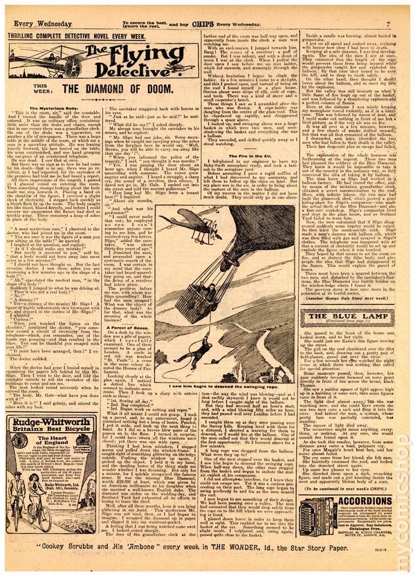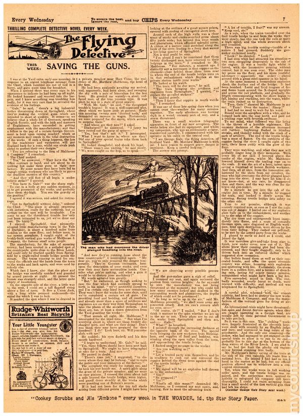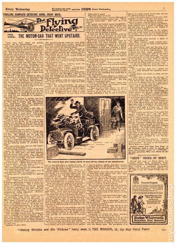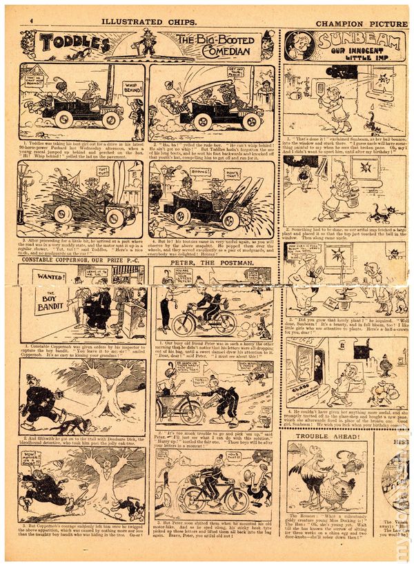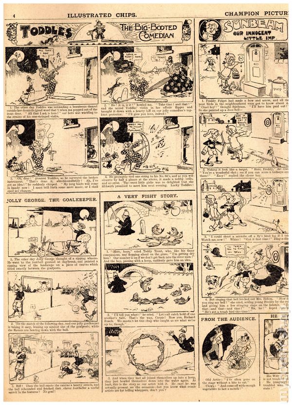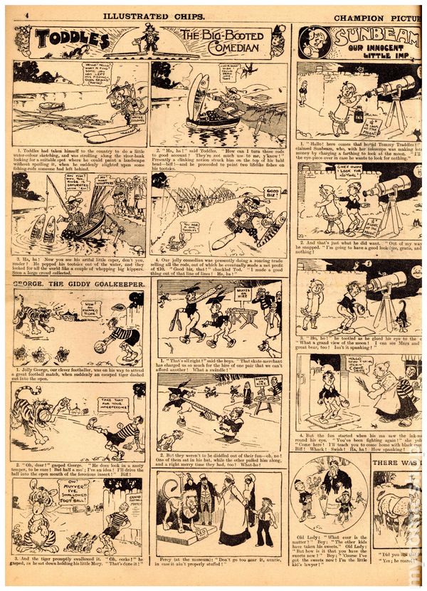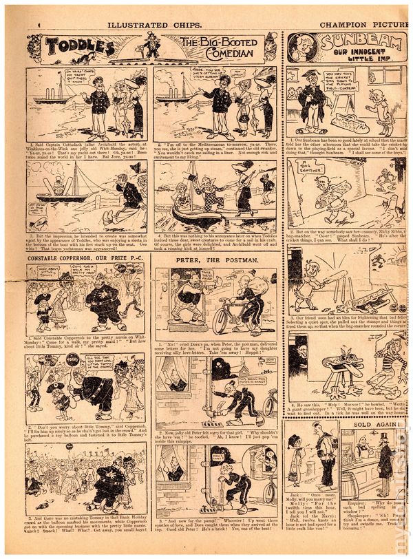 View scanMarch 24, 1928. Illustrated Chips was a weekly newspaper of comics and stories. Its most popular feature was "Weary Willie and Tired Tim, the World Famous Tramps." 10.75 in. x 14.75 in.; black and white; 8 pages. Published in London by newspaper magnate Alfred Harmsworth, it ran from 1890 to 1953. (See also "The Butterfly.")