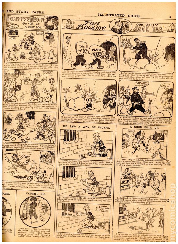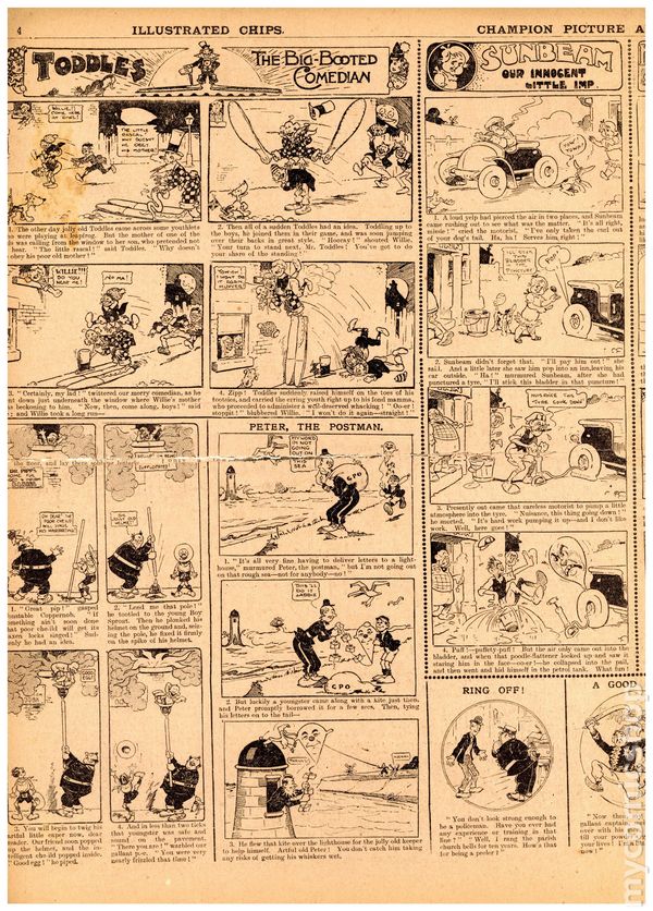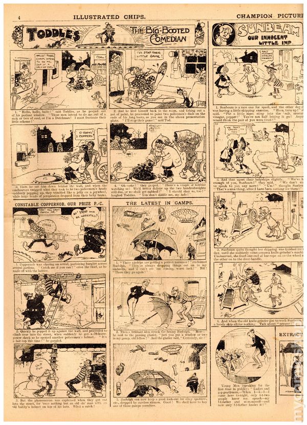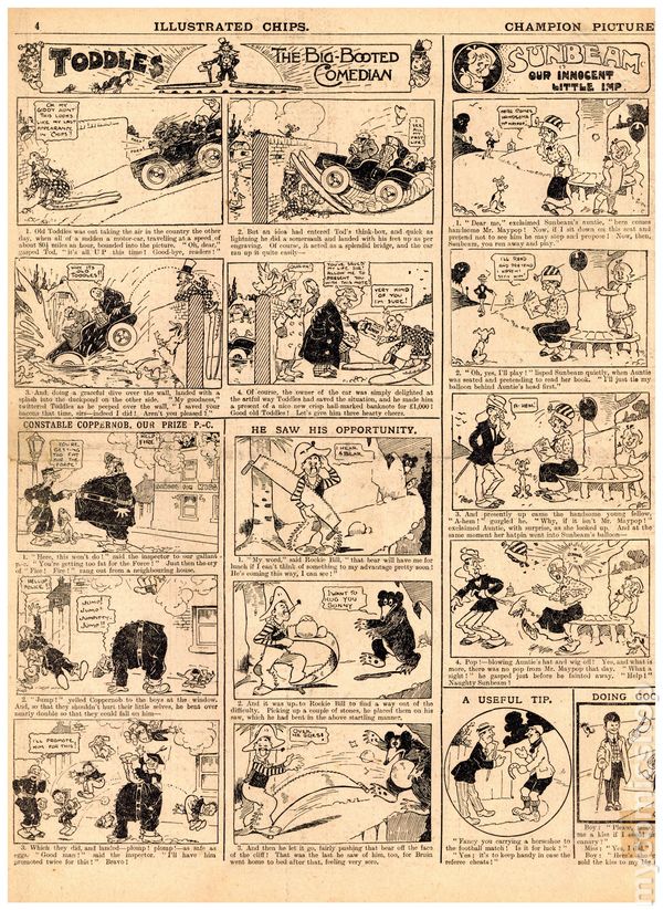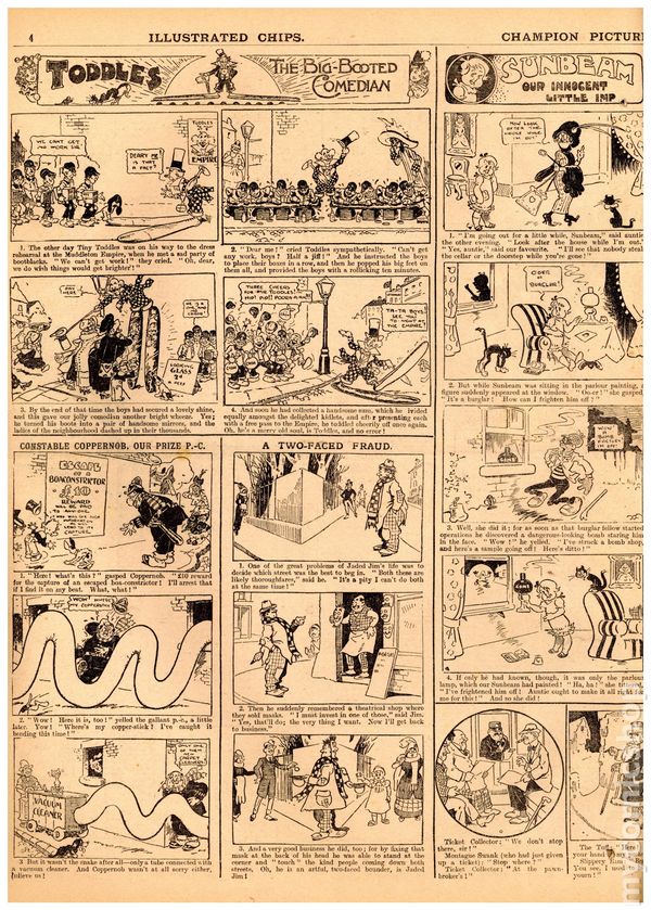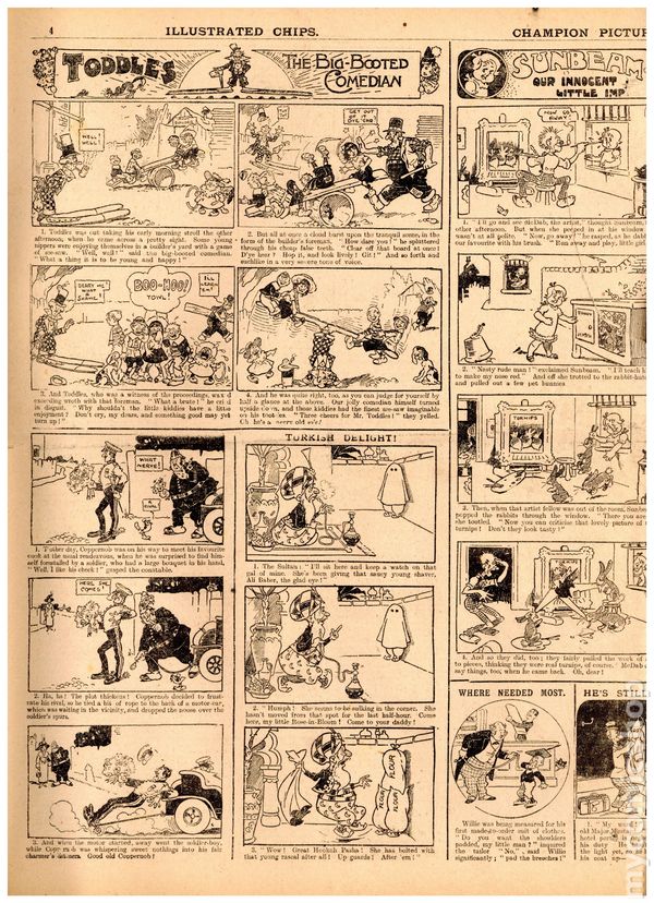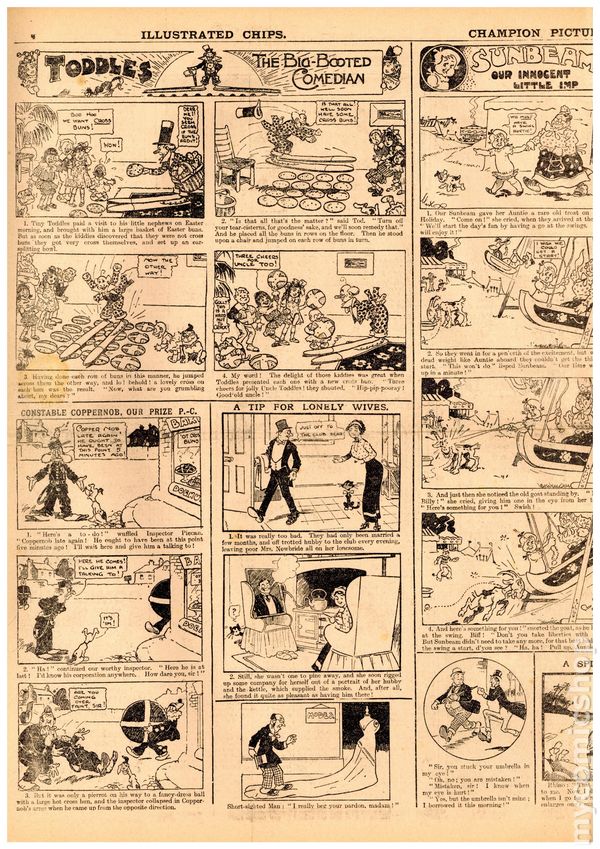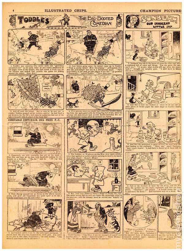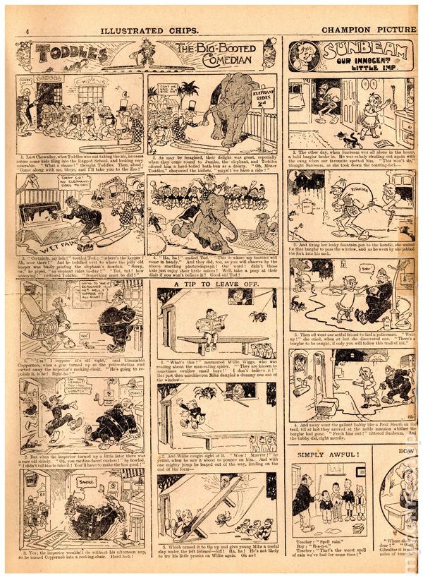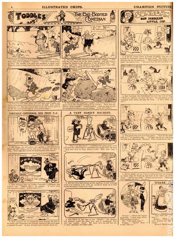 View scanOctober 27, 1934. Illustrated Chips was a weekly newspaper of comics and stories. Its most popular feature was "Weary Willie and Tired Tim, the World Famous Tramps." 10.75 in. x 14.75 in.; black and white; 8 pages. Published in London by newspaper magnate Alfred Harmsworth, it ran from 1890 to 1953. (See also "The Butterfly.")