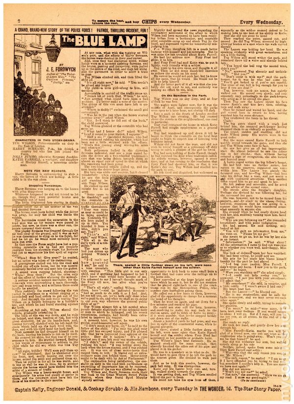 View scanJuly 31, 1915. Illustrated Chips was a weekly newspaper of comics and stories. Its most popular feature was "Weary Willie and Tired Tim, the World Famous Tramps." 10.75 in. x 14.75 in.; black and white; 8 pages. Published in London by newspaper magnate Alfred Harmsworth, it ran from 1890 to 1953. (See also "The Butterfly.")