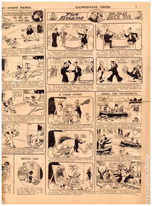 October 18, 1913. Illustrated Chips was a weekly newspaper of comics and stories. Its most popular feature was "Weary Willie and Tired Tim, the World Famous Tramps." 10.75 in. x 14.75 in.; black and white; 8 pages. Published in London by newspaper magnate Alfred Harmsworth, it ran from 1890 to 1953. (See also "The Butterfly.")