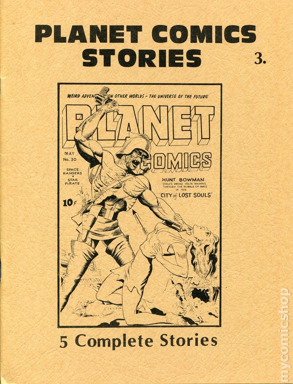 View scanGold Cover. No date. Printed with a red, yellow, blue, or gold cover (see entry). Reprints of five stories: The Lost World (from Planet Comics # 22), Buzz Crandall (from issue #8), Red Comet (from issue # 8), Flint Baker (from issue # 22), and Gale Allen (from issue # 10). The reproduction quality is only average. 8 x 11; black and white; 36 pages. Published by Al Dellinges. Cover price $3.00.