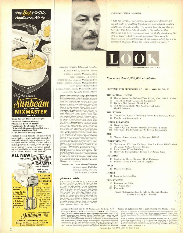 Look (1937-1971 Cowles Media) Magazine Vol. 24 #20Published Sep 1960 by Look, Inc./Cowles Magazines.