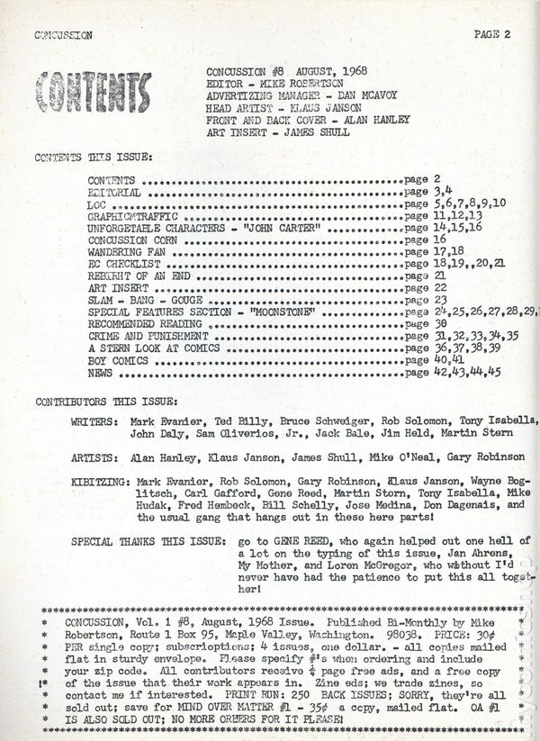 Comic articles and artwork. Tony Isabella and Mark Evanier. Spot illustrations by future pro Klaus Janson. Cover by Alan Hanley. Offset covers, mimeo interior. 46 pages.