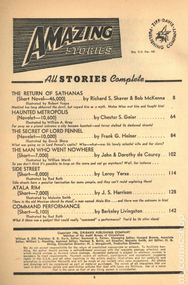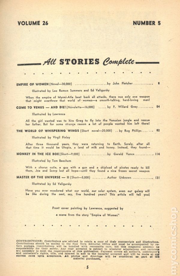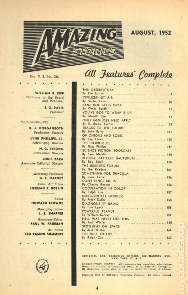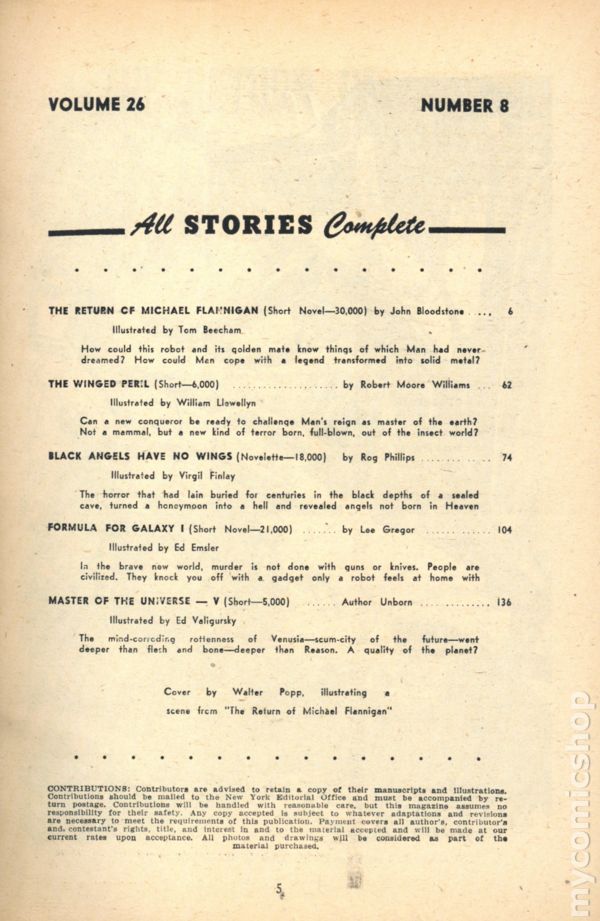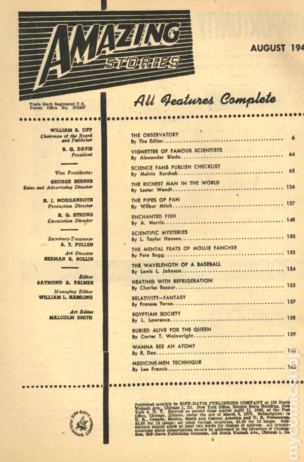 August 1926. Stories by H.G. Wells ("The Empire of the Ants"), Jules Verne ("Doctor Ox's Experiment"), Garrett P. Serviss, Jacque Morgan, M.H. Hasta, Albert B. Stuart, and G. McLeod Winsor. Edited by Hugo Gernsback. 8-in. x 11-in.; black and white with color cover; 96 newsprint pages. Cover price $0.25.