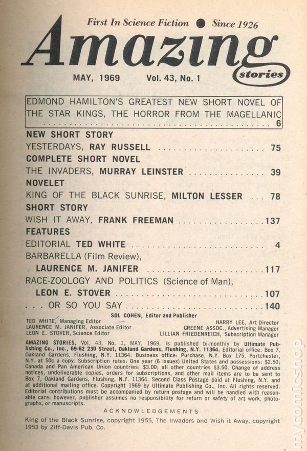 Amazing Stories (1926-Present Experimenter) Pulp Vol. 43 #10Published 1969 (est.) by Experimenter Publications.This item is not in stock at MyComicShop. If you use the "Add to want list" tab to add this issue to your want list, we will email you when it becomes available.