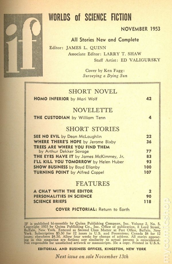 Nov 1953. Science fiction stories by Mari Wolf, William Tenn, Dean McLaughlin, Jerome Bixby, Arthur Dekker Savage, James McKimmey Jr., Helen Huber, Boyd Ellanby, and Alfred Coppel. Four Kelly Freas illustrations. Wrap-around cover by Ken Fagg. 5.25-in. x 7.5-in.; black and white; 120 newsprint pages. Cover price $0.35.