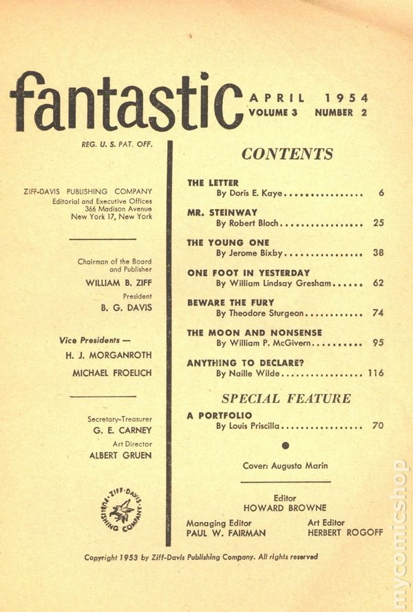 April 1954. Science fiction and fantasy stories by Theodore Sturgeon, William Lindsay Gresham, William P. McGivern, Robert Bloch, Jerome Bixby, Doris E. Kaye, and Naille Wilde. Cover by Augusto Marin. 5.5-in. x 7.75-in.; black and white; 128 newsprint pages. Cover price $0.35.