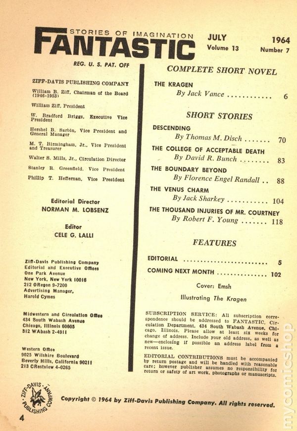 Volume 13, Issue 7 - July, 1964.Features "The Kragen" by Jack Vance, and "Descending" by Thomas Disch. 5.5-in. x 7.75-in., 130 pages, Text (with B&W illustrations throughout) Cover price $0.50.