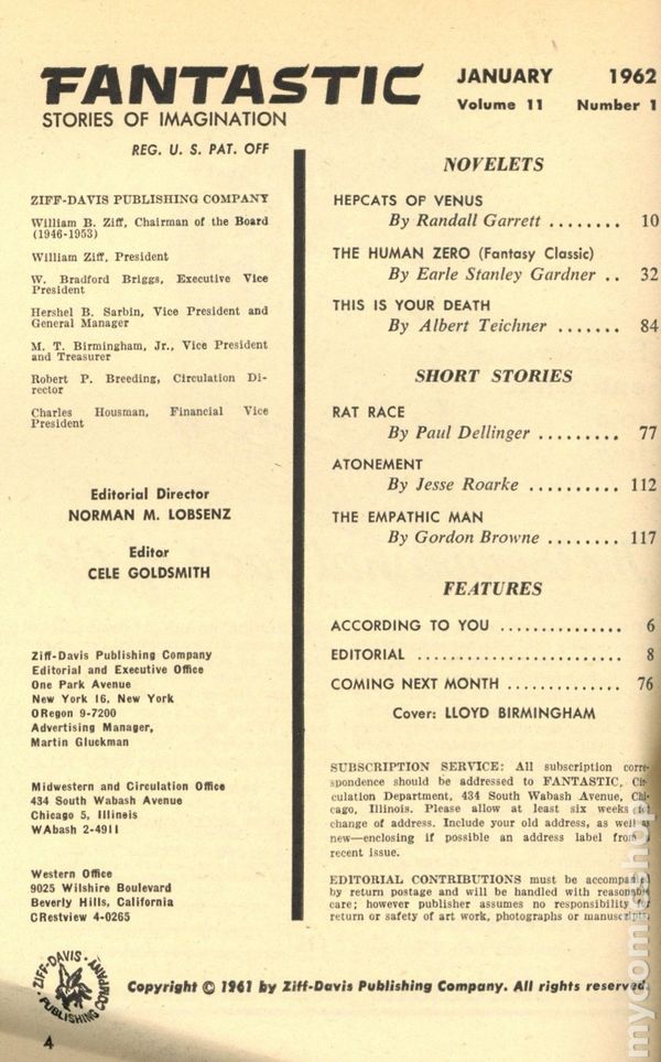 Volume 11, Issue 1 - January, 1962. Features "Hepcats of Venus" by Randall Garrett, and "The Human Zero" by Erle Stanley Gardner. 5.5-in. x 7.75-in.; black and white; 128 newsprint pages. Cover price $0.35.