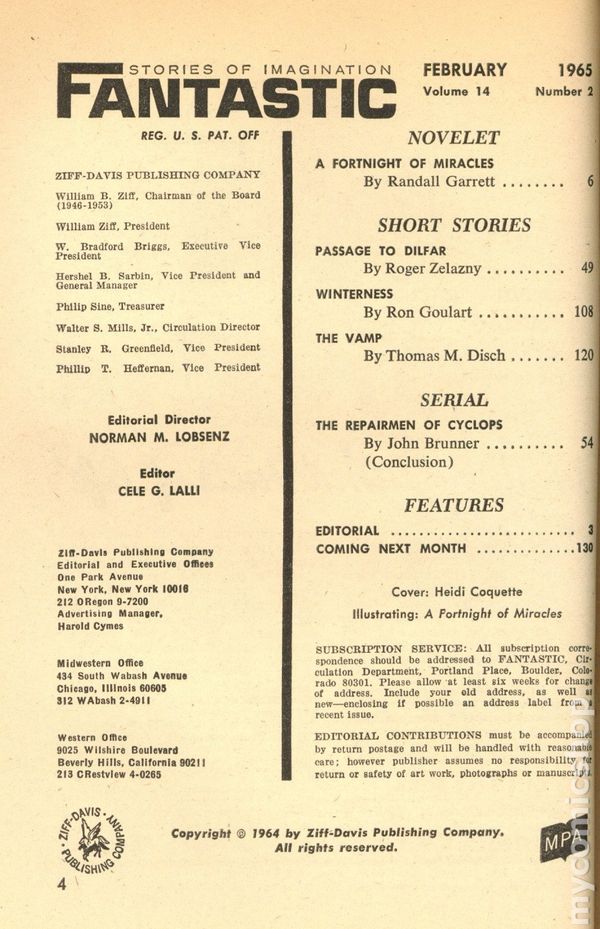 Cover by Heide Coquette. Stories by Randall Garrett, Roger Zelazny, Ron Goulart, Thomas M. Disch, John Brunner. Illustrations by George Schelling. 5.5-in. x 7.75-in.; black and white; 130 newsprint pages. Cover price $0.50.