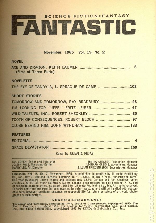 Volume 15, Issue 2 - November, 1965. Features "Axe and Dragon" by Keith Laumer, and stories by Ray Bradbury, Robert Bloch, Fritz Leiber, L. Sprague De Camp, and Robert Sheckley. 5.5-in. x 7.75-in.; black and white; 162 newsprint pages. Cover price $0.50.