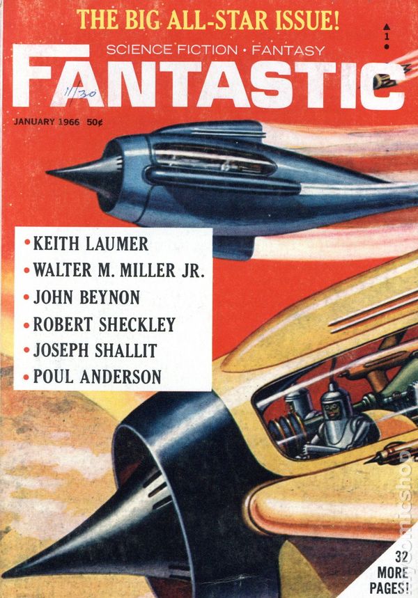 Jan 1966. Big All Star Issue. Cover by James B. Settles. Science fiction and fantasy stories by Walter M. Miller, Jr., Joseph Shallit, John Benyon, Robert Sheckley, Poul Anderson, and Keith Laumer's "Axe and Dragon" Part 2 of 3. Illustrations byVirgil Finlay, Emshwiller, Morrow, Henry C. Pitz, and Jay Jackson. 5.5-in. x 7.75-in.; black and white; 162 newsprint pages. Cover price $0.50.